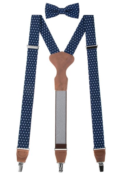 Látkové šle Y s koženým středem a zapínáním na klipy - 35 mm - v dárkovém balení, 878-197823, Modrá s bílými puntíky, černá kůže
