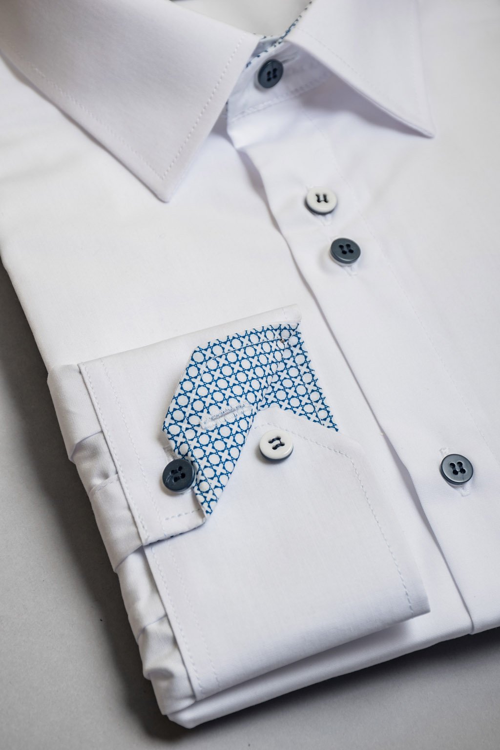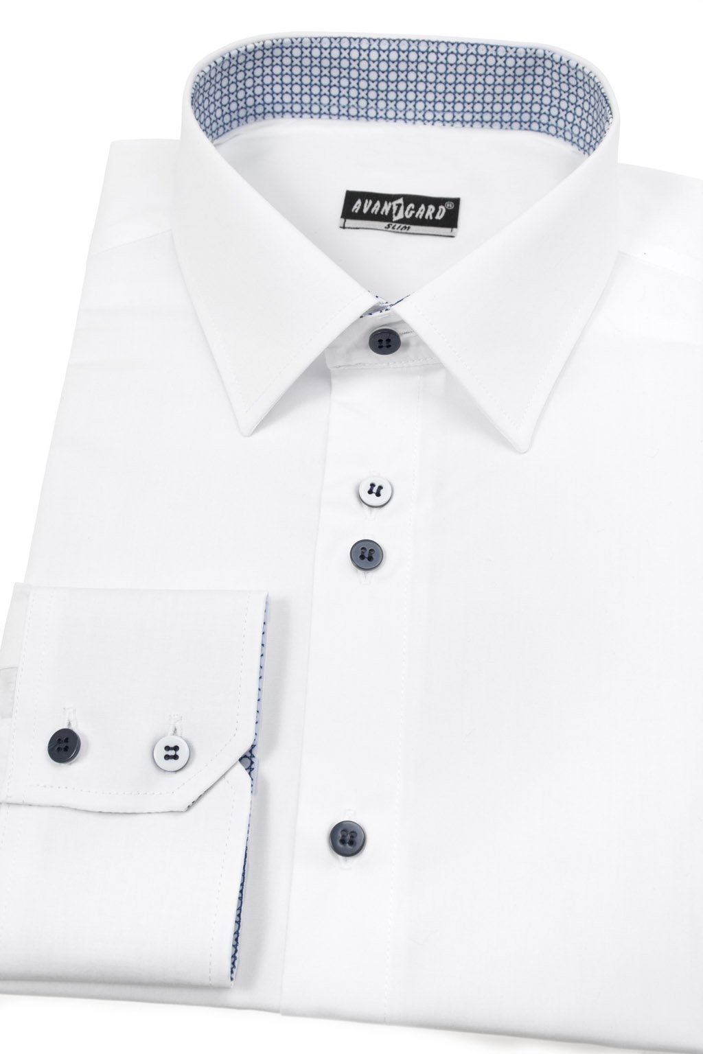 Košile v luxusním provedení vyštíhleného střihu SLIM s piccolo límečkem. Kontrastní materiál je na vnitřních manžetách a límečku.