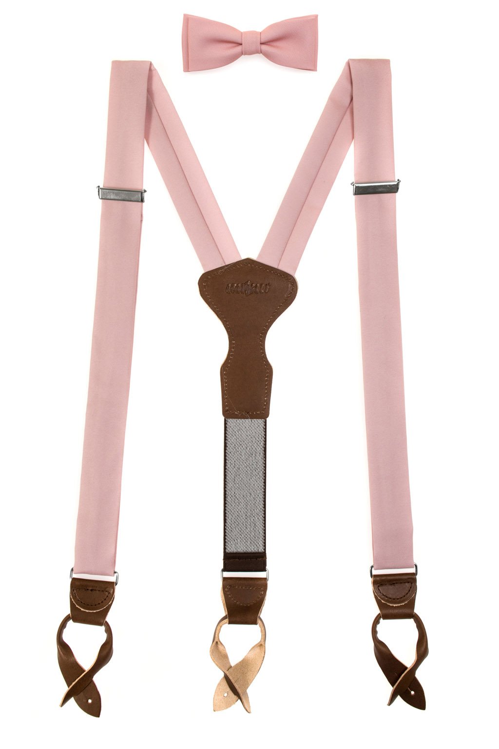 Set Látkové šle Y s koženým středem a poutky - 35 mm, motýlek a kapesníček, 885-981163, Pudrová, tmavě hnědá kůže