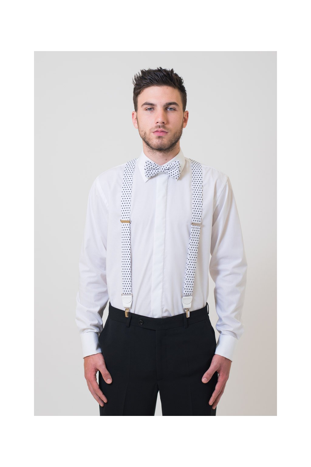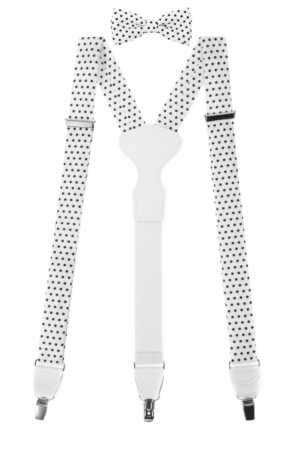 Set Látkové šle Y s koženým středem a zapínáním na klipy - 35 mm, motýlek a kapesníček, 881-197601, Bílá s černými puntíky, bílá kůže