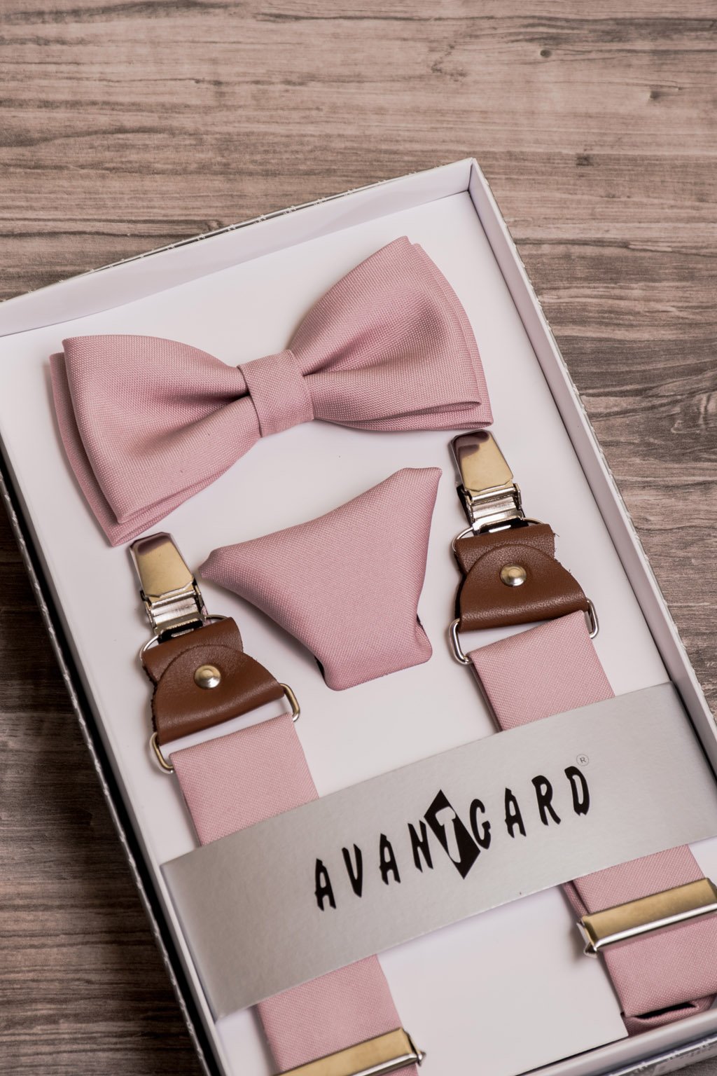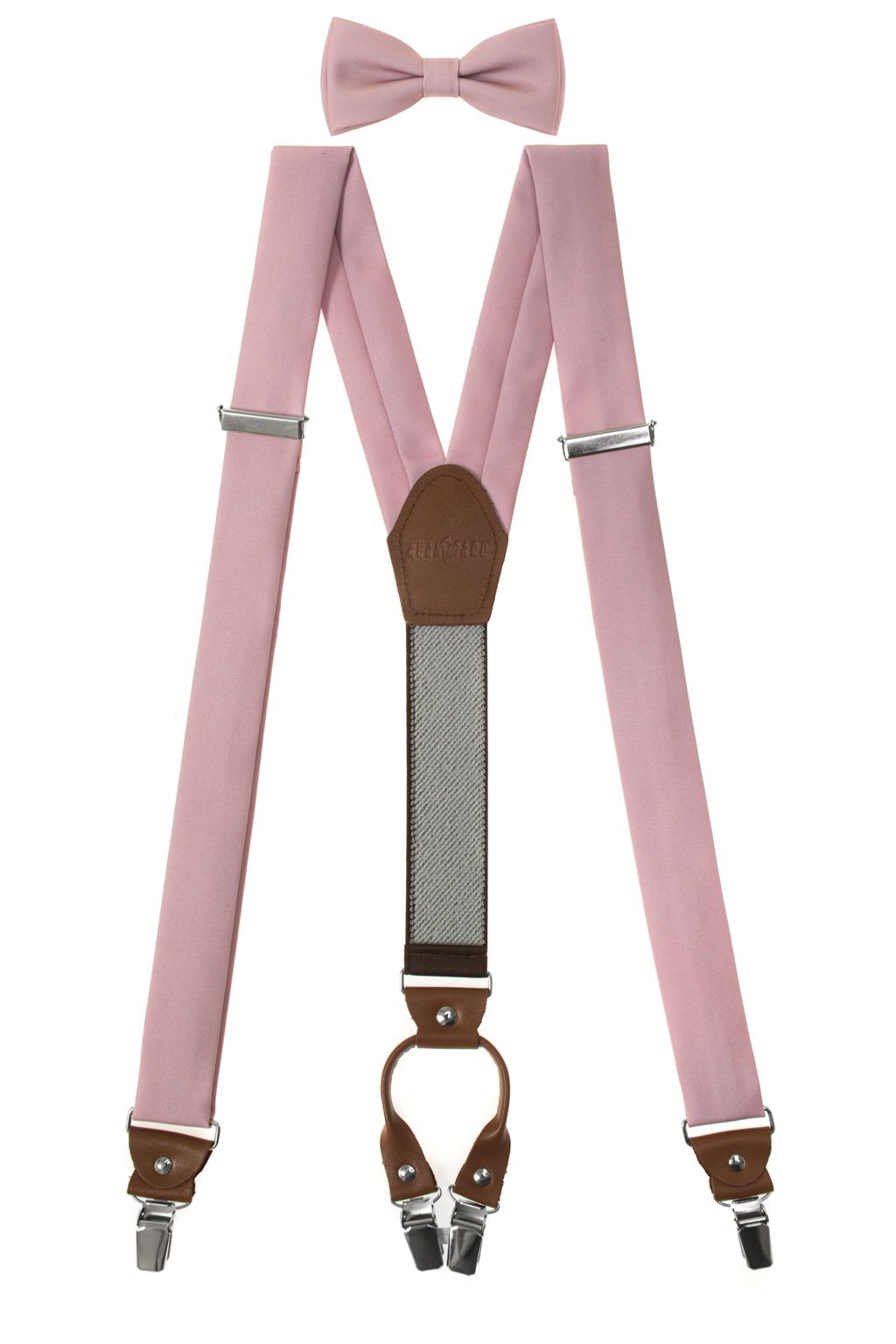 Set Látkové šle Y s koženým středem a zapínáním na klipy - 35 mm, motýlek a kapesníček, 886-986363, Pudrová, tmavě hnědá kůže