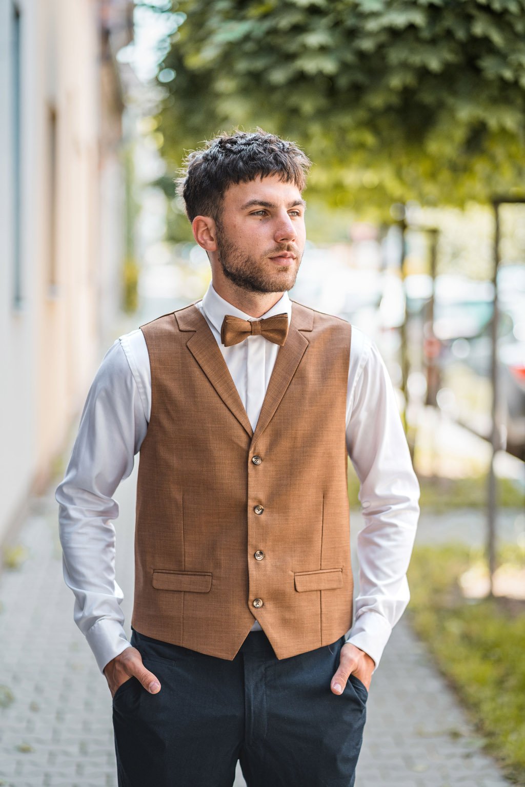 Vesta a motýlek jsou navrženy v jednotném stylu, což zaručuje dokonale sladěný vzhled. Vesta je vyrobena z kvalitního materiálu a její střih je uzpůsoben k nošení bez obleku.
