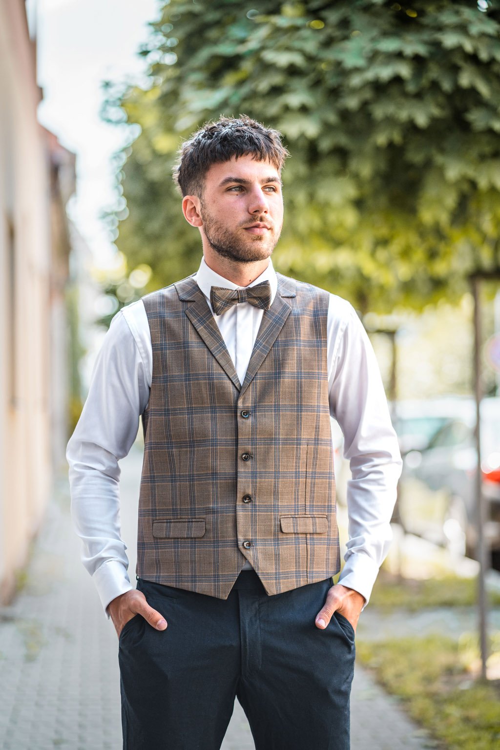 Vesta a motýlek jsou navrženy v jednotném stylu, což zaručuje dokonale sladěný vzhled. Vesta je vyrobena z kvalitního materiálu a její střih je uzpůsoben k nošení bez obleku.
