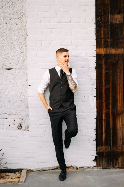 Dominancí druhého outfitu pro svatbu v mexickém stylu byla elegantní černá vestička s regatou. Vesty jsou v posledních letech velmi oblíbeným pánským doplňkem na svatby. Konkrétně tato černá vesta je ušitá tak, že ji můžete vynést do obleku, ale i samostatně. O rozdílu mezi oblekovou a touto univerzální vestou se dočtete v článku: Jak nosit společenské vesty. Monochromatický look ženicha vytvořil na svatbě zajímavý kontrast k bohatě zdobené a barevné mexické dekoraci.