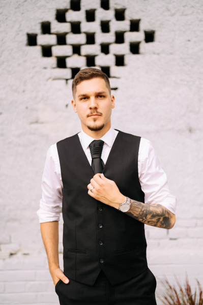 Černá vesta z tohoto editorialu je u nás na e-shopu k dodání v setu s motýlkem. Pro tuto svatbu jsme však ženichovi zvolili jako doplněk černou regatu, která se hodí na slavnostní příležitosti. Dále ženich oblékl bílou košili vyštíhleného střihu SLIM s krytou légou a klasickým límcem. Košile má speciální úpravu NON IRON, která zajišťuje sníženou mačkavost a snadnou údržbu.