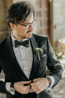 Ženich oblékl pánskou smokingovou košili SLIM s krytou légou a dvojitými manžetami na manžetové knoflíčky. Ke košili jsme vybrali sadu knoflíčků do smokingové košile. Pro elegantní vzhled nesměl chybět hedvábný vázací motýlek v černé barvě. Pod sakem se ukrýval hedvábný smokingový pás a v kapsičce saka byl vložen bílý hedvábný kapesníček. Pro více inspirace se podívejte na galerii fotografií, kde uvidíte všechny pánské doplňky přímo na ženichovi v jeho svatební den.
